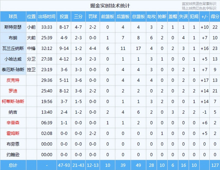 掘金这边,6人得分上双,替补席直接炸了。瓦兰丘纳斯全场砍下23分17篮板4助攻2盖帽,内线完全统治了比赛,雷霆根本没人能对上他。斯特劳瑟17投8中,三分7中4,高效拿到22分4篮板3助攻2抢断1盖帽。最让人惊喜的是罗迪,他在末节一个人砍下16分,全场拿到21分2篮板2抢断,末节那波个人11-0攻势直接把比赛带走了。皮克特13分4篮板4助攻,小哈达威13分3助攻,布朗10分8篮板6助攻2抢断,全面得不能再全面。就连替补席上的纳吉也有5分6篮板2助攻3盖帽的亮眼表现。