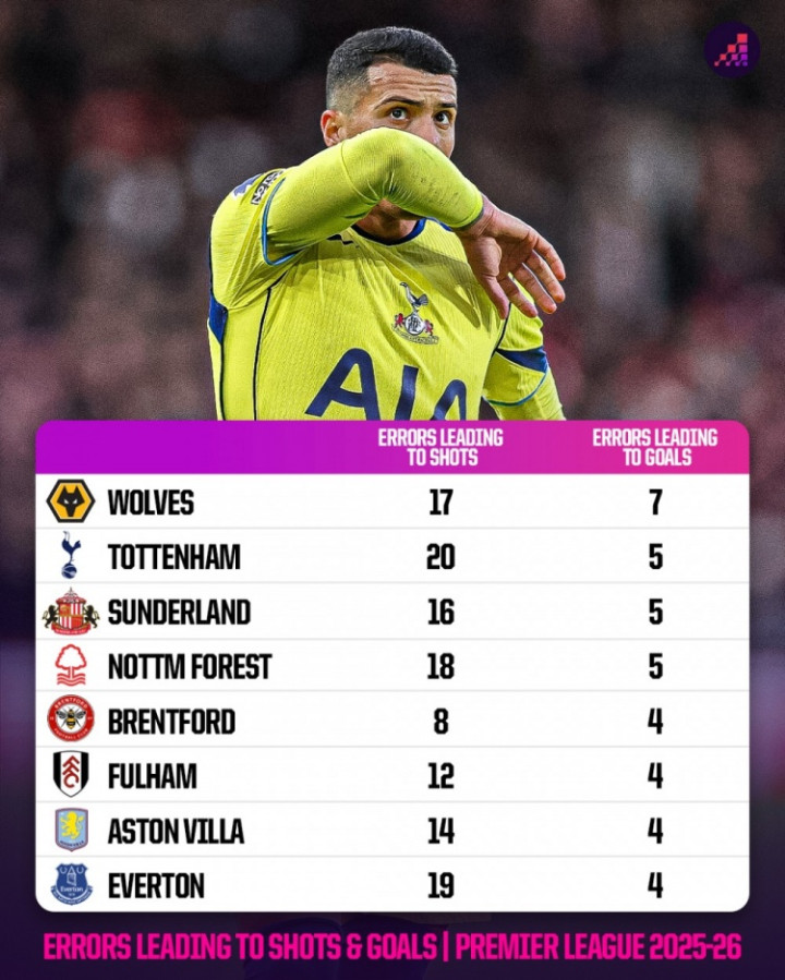 英超失误导致丢球榜: 狼队7球居首, 热刺、桑德兰、森林5球次席