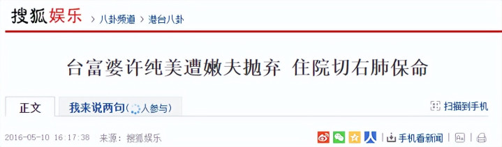 搜狐娱乐——台富婆许纯美遭嫩夫抛弃 住院切右肺保命